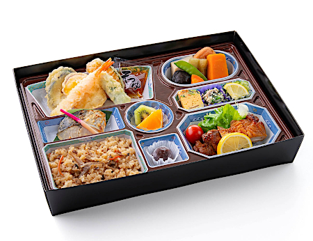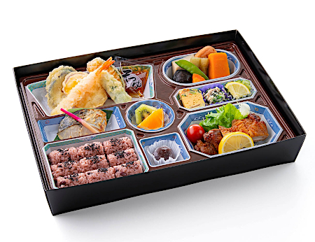 天ぷら(えび・さつまいも・かぼちゃ・なす・オクラ)・チキンステーキ・さごしの西京焼き・炊き合わせ・きゅうり酢・五目だし巻・白和え・俵おにぎり・フルーツ・甘味