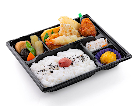 白飯・かつお梅・天ぷら(えび・いか・かぼちゃ)・唐揚げ・つるやミニコロッケ・だし巻き玉子・煮物(がんも・椎茸・フキ・人参・絹さや)・大根生酢・ほくほくサラダ